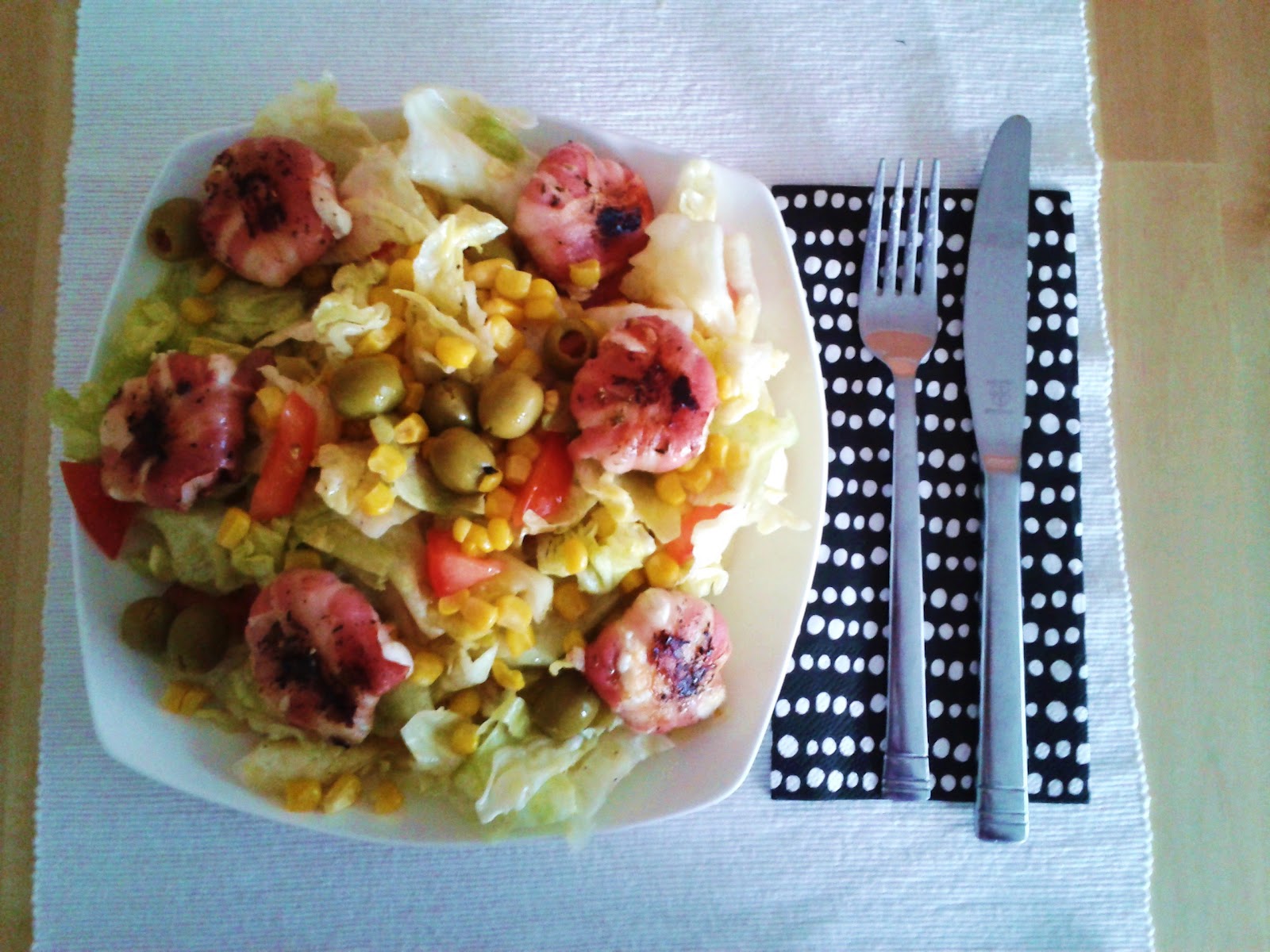 Blattsalat mit scharfem Hähnchen, Tomate und goldgelbem Mais
